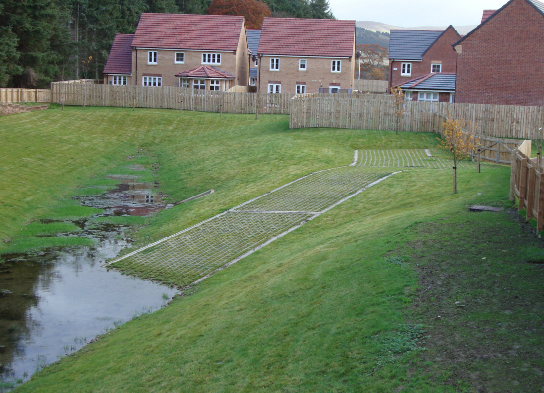 The focus on storm water management in the UK is steadily shifting away from traditional piped sewers to surface attenuation as shown here with this housing project. By retaining storm water on site the peak demand on the main sewer infrastructure has been reduced and a landscaping amenity gained.