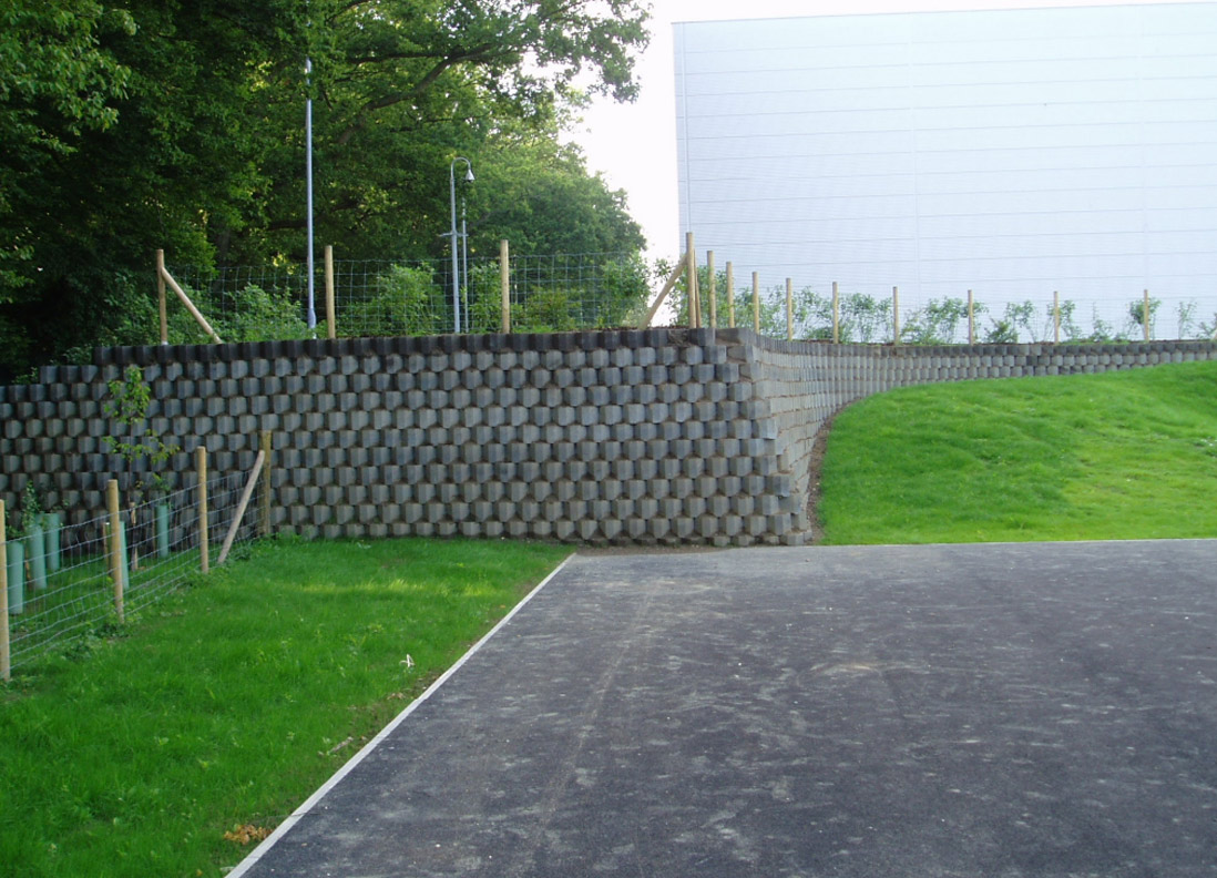 This particular photograph details a raised parking and turning area created by a subtle plateauing of the sloping ground. The grey Betoatlas units show their flexibility with the ability to step the foundations tangential to the slope as well as being able to form the irregular corner detail without the need for separate units.