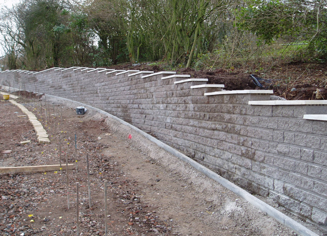 With a length in the wall of just 200mm the Leromur units were easily able to accommodate the gradient and the varying plan profile of the walls. With a structural backfill reinforced laterally by Betonap woven geo-grids to a Betocalcul warranted design the dry laid walls were able to function immediately.