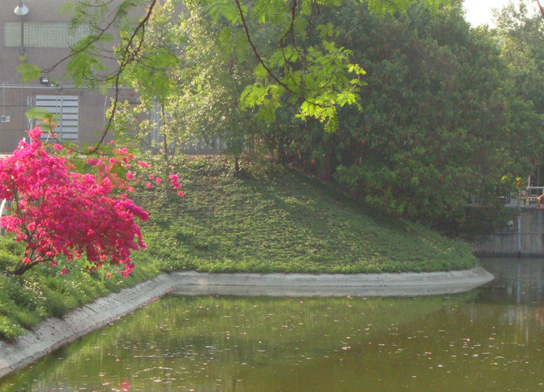 Near to the border at Lok Ma Chau lies the first floodwater pumping station with an attenuation lagoon. The lagoon has a managed permanent water level helping to maintain the indigenous wetland culture of the New Territories. This sees a solid concrete base to the lagoon with its upper slopes and those of the feeder channels faced with 76mm thick Grasscrete GC3 laid to the sub-grade. Tree pits have been incorporated into the slopes and the area is now a haven for bright pink Camellias that enhance this tranquil setting.